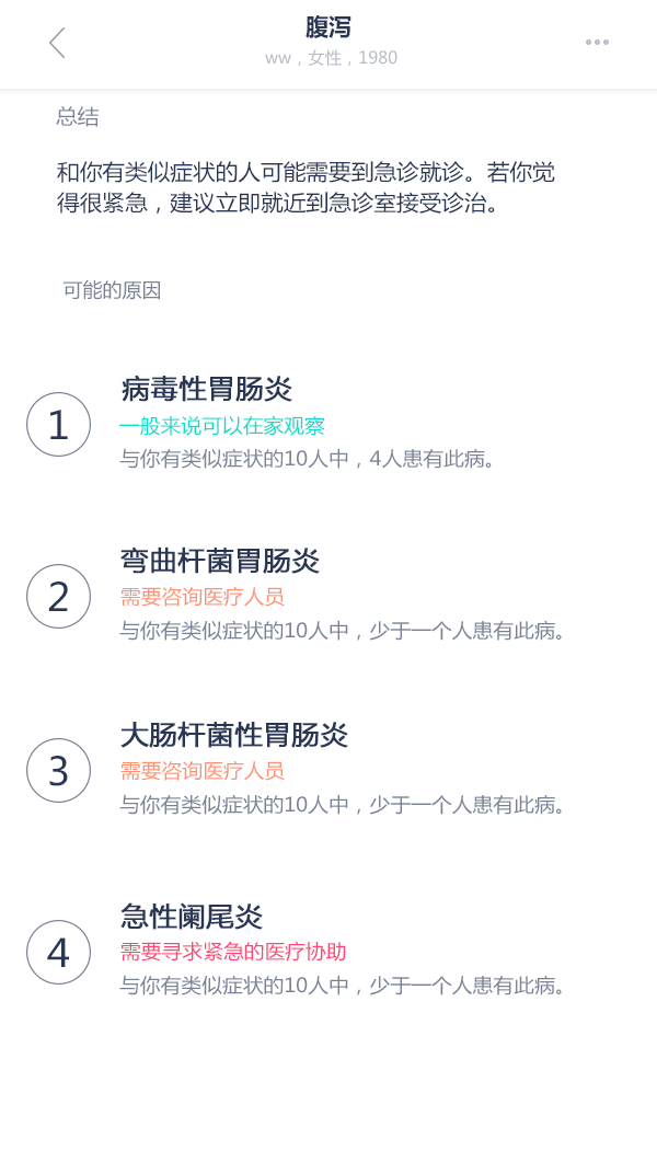 爱达询问简单、相关的问题,并将你的回答与成千上万个相似的病例对比,帮助你找出出现这种症状最可能的原因。